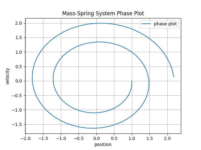 and the phase plot via plotting (position(t), velocity(t)) as a two dimensional curve:
