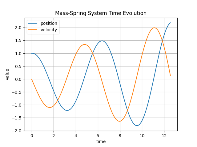 MassSpring object, and pass it to the ExplicitEuler timer-stepper. Then we can run a simple time-loop to evolve the state by time-steps \(\tau\):
