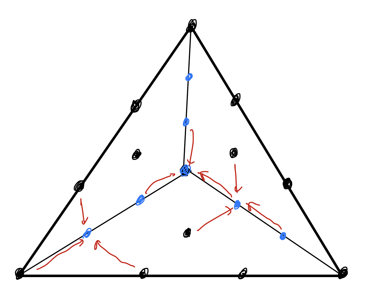This basis functions can be associated to nodes \(x_{ijk} = \sum_{m=1}^3 \lambda_i V_i\)
